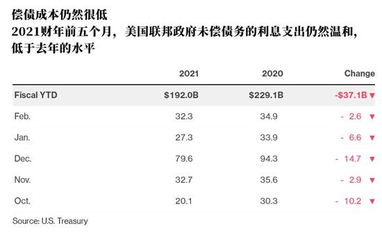 尽管面临大规模防疫支出以及国债价格下挫导致10年期收益率触及逾12个月来最高的局面,去年美国国债的利息支出仍下降至3450亿美元或占GDP的1.6%,且有望在2021年进一步缩小。