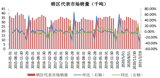 数据来源:卓创资讯、方正中期而目前淘鸡不佳存在延淘惜售主要原因还是在于养殖户的心理,市场多看好后期行情,这从目前的期现价差上也能看出,为此部分养殖户同样看好后市行情,不愿过多淘鸡都想等着其他人先淘自己等待涨价,所以淘鸡的心理更多在于蛋价变动,蛋价涨了淘鸡推迟蛋产增加反制蛋价,蛋价降了淘鸡加快利于后市上涨。消费淡季仍持续,遥望清明及五一需求方面,目前仍处在鸡蛋季节性消费淡季,从春节后一直到3月份鸡蛋都处在刚需消费中,期间缺乏重大节日拉动消费,而企业、学校食堂适量采购,贸易商基于余货压力,多顺价清理库存,流通环节库存得以缓解。据卓创数据显示,2月份主销区市场鸡蛋总销量16395.50吨,环比跌幅42.40%, 同比跌19.47%。
