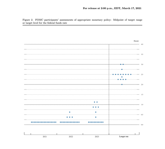 美联储点阵图显示,美联储预计将维持利率在当前水平直至2023年,与去年12月一致,但18位官员中有7人预计当年至少会加息一次;有4名委员预计在2022年至少加息一次。