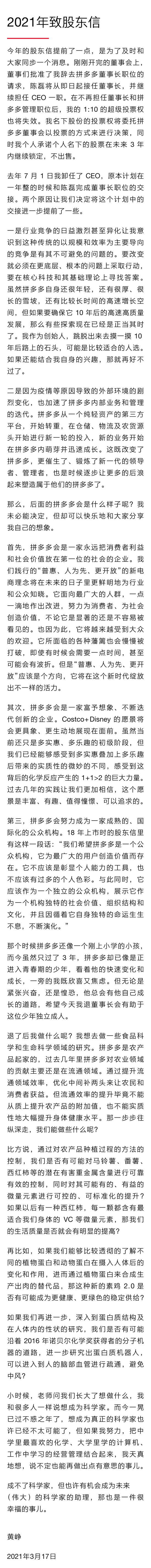 3月17日,拼多多创始人黄峥发布年度致股东信。