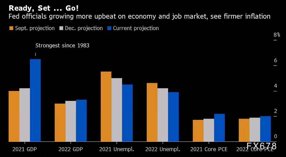 美联储上调了对经济增长率和劳动力市场预测,预估中值为2021年年末失业率降至4.5%,2023年降至3.5%,预计今年的GDP将增长6.5%,高于此前预测的4.2%。