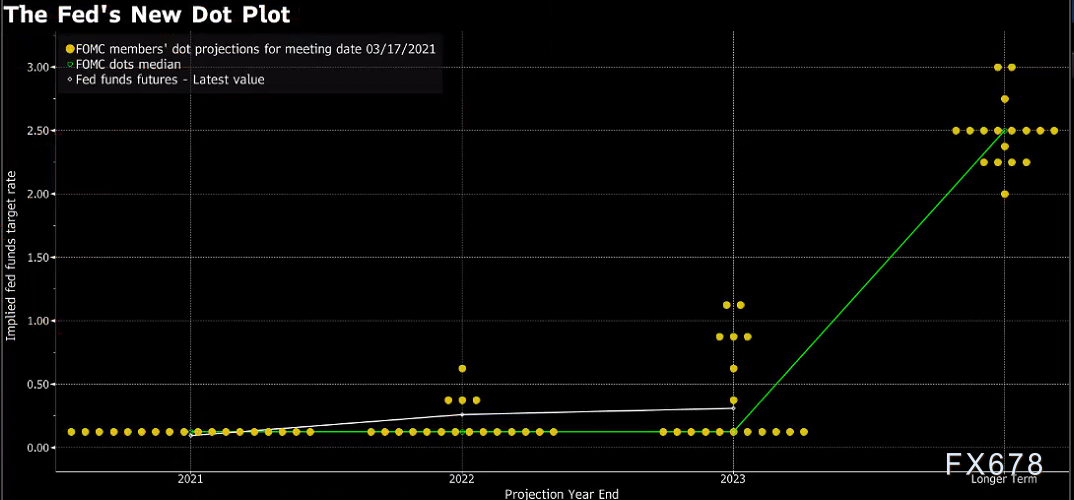 点阵图显示,在18位美联储官员中,7人预计到2023年底前利率将上升,上次会议中只有5人抱此看法。他说,委员会多数成员预计未来三年的利率将接近零。在上调之前,他们还需要看到“实际进展,而不是预测进展--这不同于我们过去的方法。”
