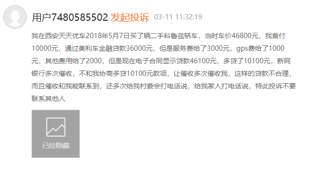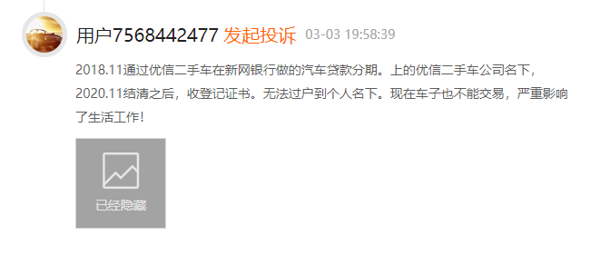 公共投诉平台黑猫投诉上可以搜索对“新网银行”的投诉,在3月份的投诉记录中,涉及到新网银行的汽车分期平台有美利车金融以及优信二手车。