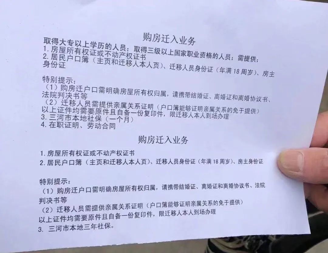 不过,3月18日,廊坊三河市公安局人口管理大队发出最新要求:落户需持有本地房本及相关社保证明(有大专以上学历或取得三级以上国家职业资格人员,需有三河市本地社保1个月;低于上述要求的,需有三河市本地社保3年),政策似有收紧之嫌。