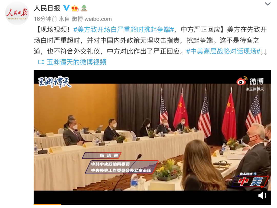 据@人民日报 消息,美方却在先致开场白时严重超时,并对中国内外政策无理攻击指责,挑起争端。这不是待客之道,也不符合外交礼仪,中方对此作出了严正回应。