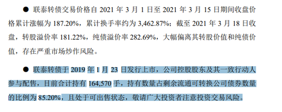 该公告还进一步提示风险表示,截至3月18日收盘,联泰转债价格为362.68 元/张,纯债溢价率282.69%,转股价值为128.97元/张,当前转债价格相对于转股价值溢价181.22%,存在交易风险和一定的估值风险。