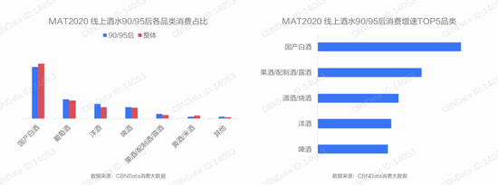 从品类上来看,白酒、葡萄酒和洋酒是年轻人线上消费酒水单的前三位品类,其中,白酒的增速也最高。
