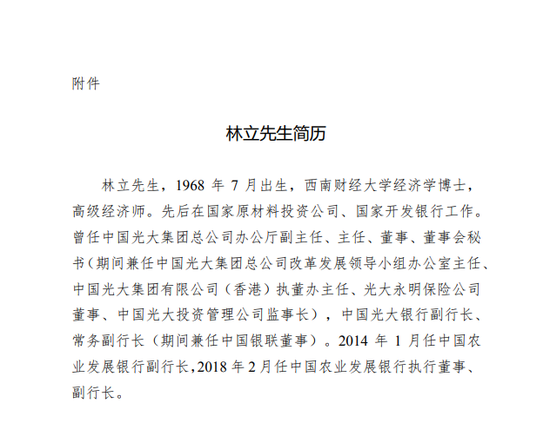 农业银行提名林立为董事候选人及聘任为副行长