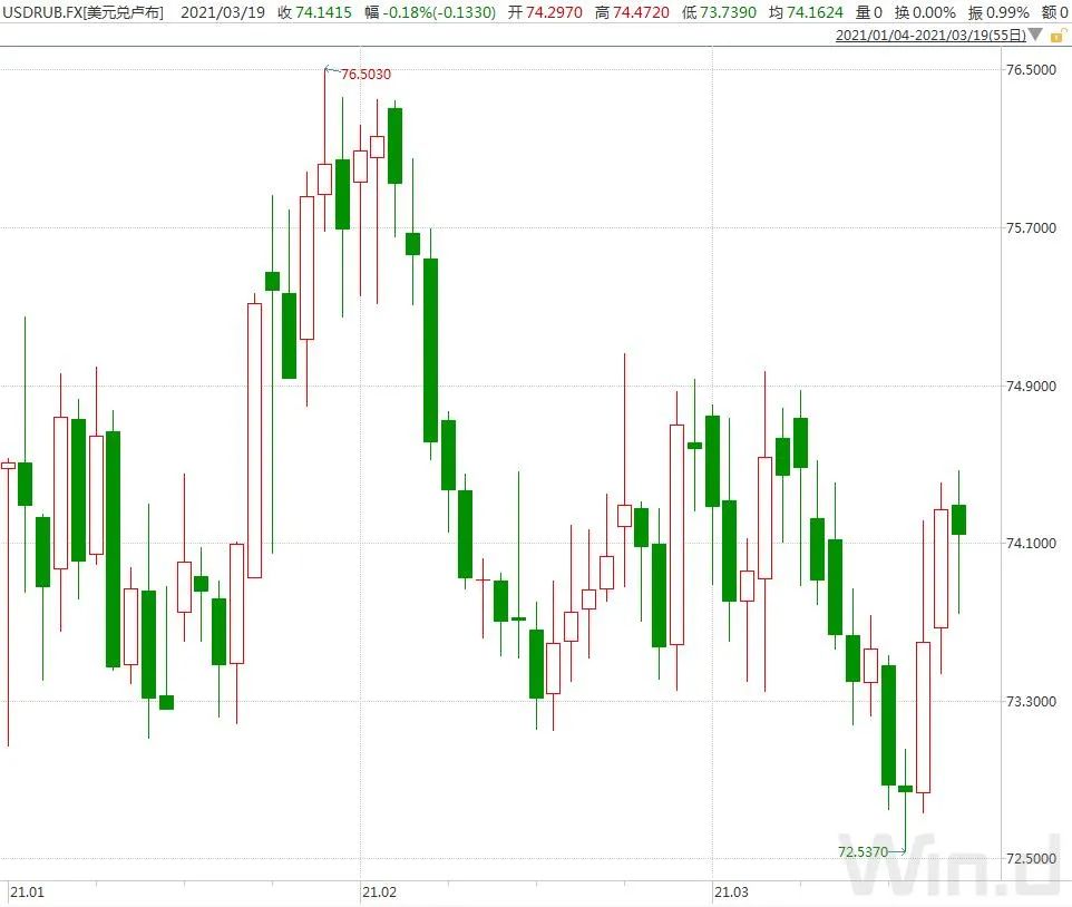 消息公布后,美元兑俄罗斯卢布USD/RUB短线小幅下挫,现报73.78。