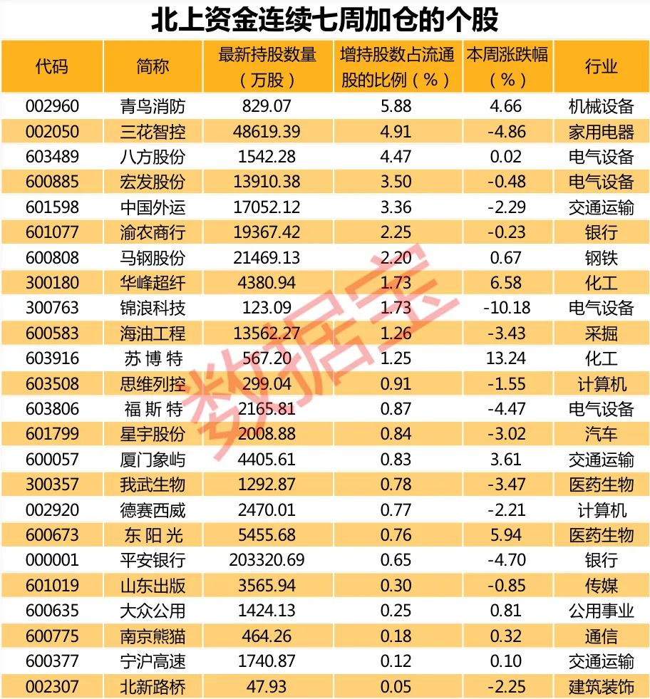 北上资金连续四周买入114股。分行业来看,交通运输行业个股较多,有12只。其中,24股被北上资金连续7周加仓。