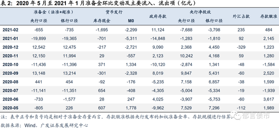 2月超储率较低。经我们估算,今年2月末超储率1.0%(估算方法详见《如何测算超储率?——债市流动性框架之一》),与1月末基本持平(考虑小数点后两位则2月更低),明显低于2020年12月末的2.2%。但从银行间市场资金价格来看,2-3月流动性相比1月中下旬明显转松,与2月末较低的超储率似乎相悖。先来看央行发布的准备金科目,包括法定准备金和超额准备金,无论是央行口径(来自货币当局资产负债表)、还是银行口径(来自其他存款性公司资产负债表),1月为减少近2万亿元,2月则减少不足1000亿元。考虑到法定准备金率不变的前提下,法定准备金随存款增长而增长,因而1月和2月准备金下降,背后可能均是超额准备金减少。然后拆分准备金的五大流入流出项,可以发现,尽管2月政府存款补充约1.1万亿元,但央行净投放为负,货币发行均对准备金形成消耗,从而导致准备金小幅下降(主要是超额准备金下降)。