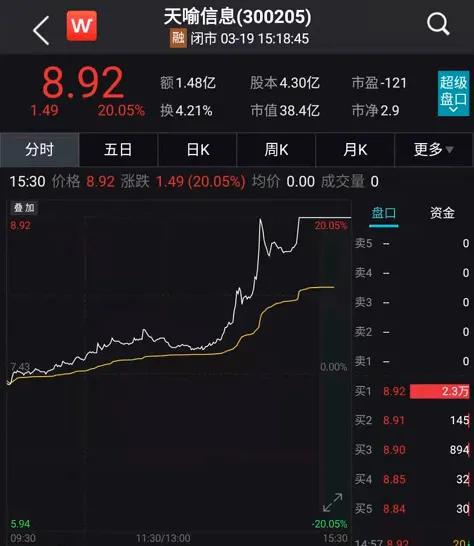 记者注意到,就在这笔交易正式落地前,天喻信息上周五尾盘突然拉升,2.3万手买单封死20%涨停板。