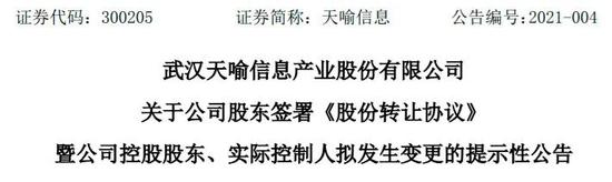 简单回溯。2020年7月,天喻信息披露了大股东华科大产业集团、华工创投拟通过公开征集转让方式寻找受让方的公告;2020年12月,天喻信息披露艾迪和闫春雨实际控制的同喻投资符合受让条件。