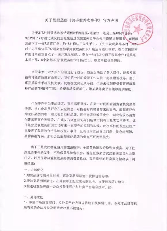 3月22日,商家靓靓蒸虾发布公告回应该事件:将内部优化外卖服务,希望市场监督部门、外卖平台能协助维权。