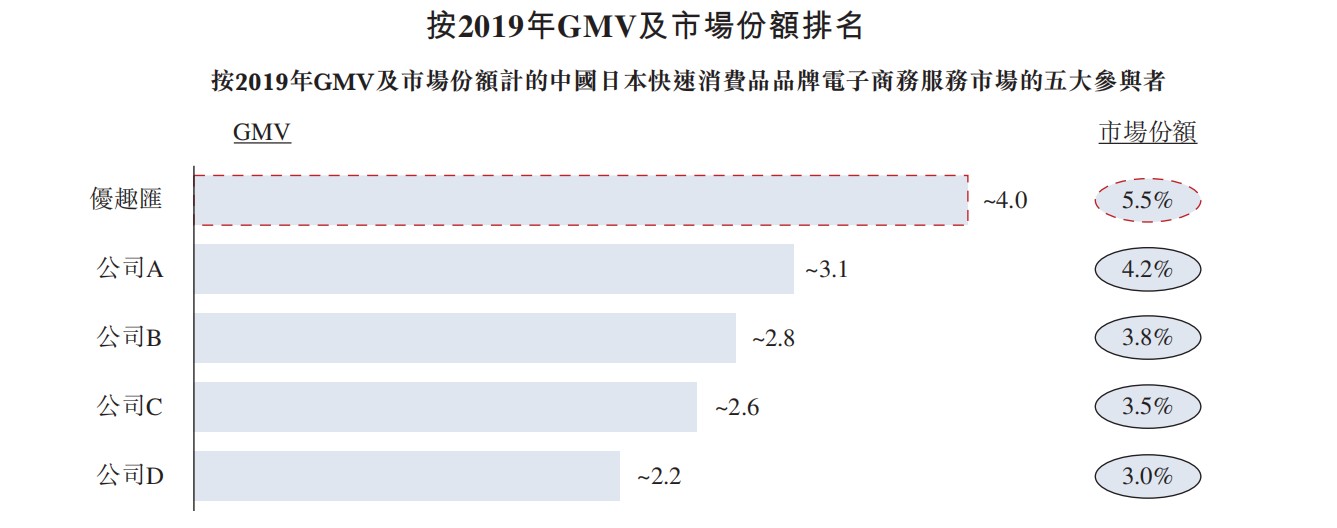 据灼识谘询报告显示,以2019年通过电子商务渠道在中国出售的日本品牌快速消费品GMV计算,优趣汇是中国排名第一的品牌电子商务解决方案提供商,市场份额为5.5%。基于此可知,在日妆代理商界,优趣汇还是具有一定的规模优势的。