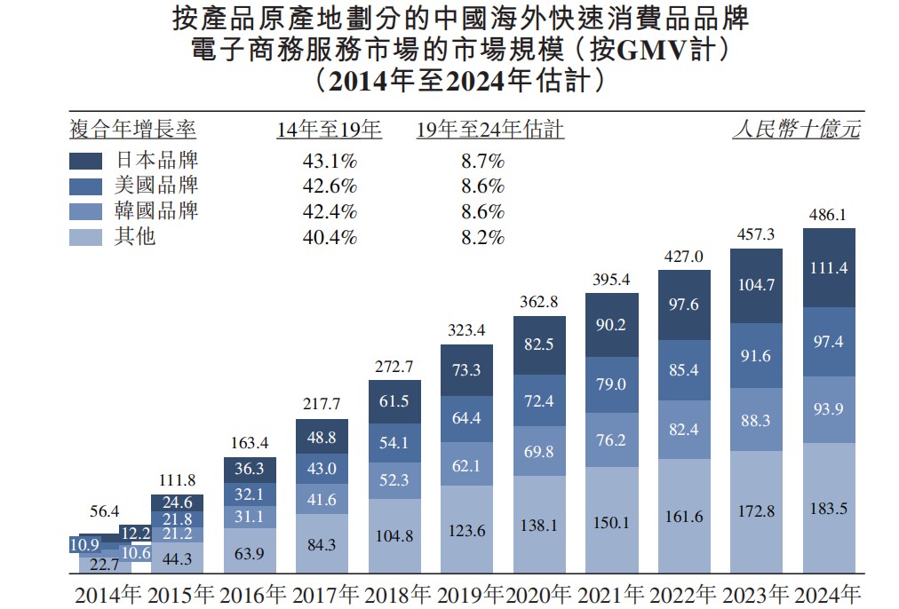 据灼识咨询报告,日本为中国消费者最受欢迎的跨境进口在线零售市场原产国,按2019的GMV计,20.6%的跨境进口产品来自日本(主要为个人护理及美妆产品)。而15%及10.8%的跨境进口产品乃分别来自于美国及韩国。在跨境进口在线零售市场的前五大原产国中,日本的年增长率亦最高,其2019年的GMV较2018年增长约15%。