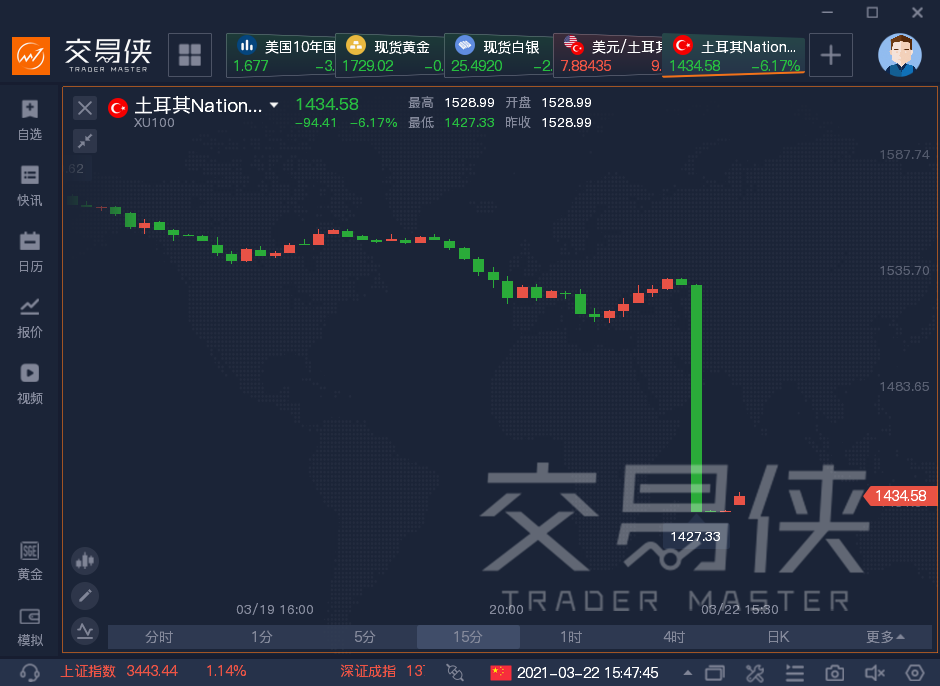 土耳其央行行长被免职一事,引发了土耳其金融市场的巨震。不仅土耳其里拉暴跌。土耳其的股市和债市也出现剧烈波动。土耳其伊斯坦布尔100指数跌7%,再次触发熔断。伊斯坦布尔证券交易所表示,整个市场的熔断机制已经触发。股票市场、衍生品市场的股票和股票指数合约以及债务证券股票回购市场的交易暂停。