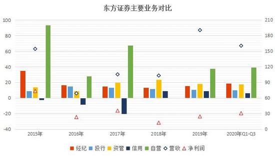 以利息净收入计,从2011年到2017年,东方证券信用业务收入均为负值;2018年以来终于“转正”,当期揽收8.71亿元,2019年增至8.91亿元;而在2020年前三季度,该项业务收入为5.97亿元。