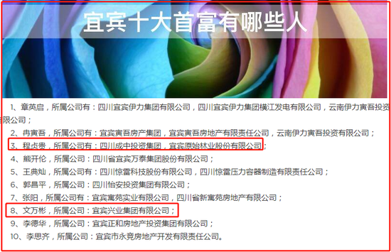 另据网传的宜宾市十大富豪榜单显示:文万彬以2亿总资产位列第八名。