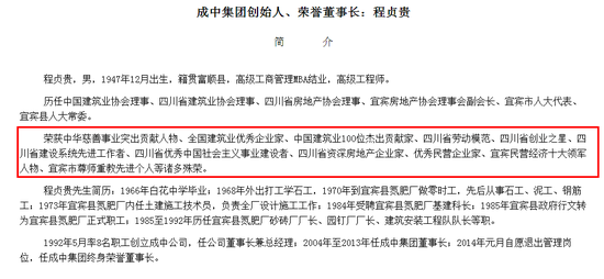 四川成中控股集团官网介绍:程贞贵不仅担任多个社会职务,还有诸多荣誉在身,包括中华慈善事业突出贡献人物、全国建筑业优秀企业家、中国建筑业100位杰出贡献家、四川省劳动模范、四川省创业之星、四川省建设系统先进工作者、四川省优秀中国社会主义事业建设者、四川省资深房地产企业家、优秀民营企业家、宜宾民营经济十大领军人物、宜宾市尊师重教先进个人等诸多殊荣。