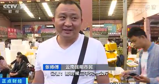 云南昆明市民 张师傅:7月4日买的,1公斤3000元,还算便宜的。刚开始六七千一公斤、一万多一公斤的也有,现在价格是500元。