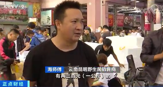 云南昆明野生菌销售商 海师傅:每天基本是200盒以上,一盒一公斤左右,一天卖出一吨多,因为我们出口也走一部分,市场也走一部分。