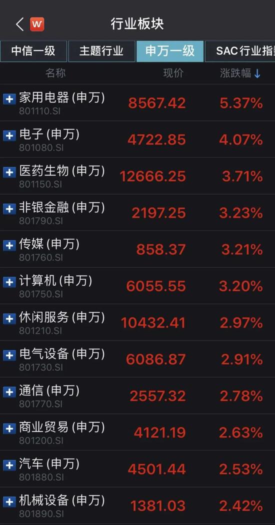申万一级28个行业全线上涨,家用电器、电子、医药生物行业涨幅居前,分别上涨5.37%、4.07%、3.71%,涨幅最小的食品饮料行业上涨0.69%。