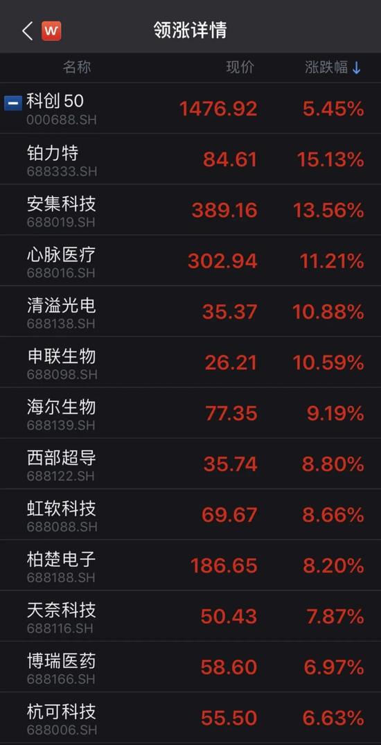 截至收盘,上证指数上涨2.06%,报3294.55点,逼近3300点;深证成指上涨3.12%,报13557.44点;创业板指上涨3.78%,报2767.40点;科创50指数上涨5.45%,报1476.92点。