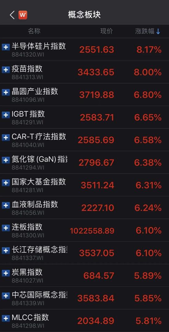 在创业板、科创板大涨的背后,是今日医药生物股及科技股的大幅上涨。Wind数据显示,今日申万一级医药生物指数上涨3.71%,电子、计算机、通信等科技板块分别上涨4.07%、3.20%、2.78%。概念板块中,涨幅居前的板块多数为科技板块,其中科技板块的半导体硅片、晶圆产业、IGBT分别上涨8.17%、6.80%、6.65%。