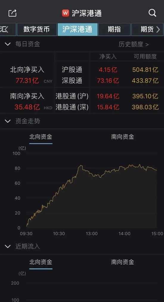 从资金情况来看,在连续四个交易日净流出后,今日北向资金回来了。Wind数据显示,北向资金全天净流入77.31亿元,其中沪股通资金净流入4.15亿元,深股通资金净流入73.16亿元。