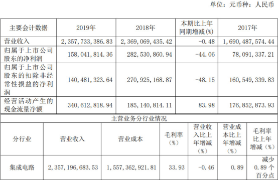 上市当年,晶晨股份业绩变脸,营收和净利均下滑。2019年,晶晨股份实现营业收入23.58亿元,同比减少0.48%;归属于上市公司股东的净利润1.58亿元,同比减少44.06%;归属于上市公司股东的扣除非经常性损益的净利润1.40亿元,同比减少48.15%;经营活动产生的现金流量净额3.41亿元,同比增长83.98%;主营业务毛利率33.93%,较上年减少0.89个百分点。