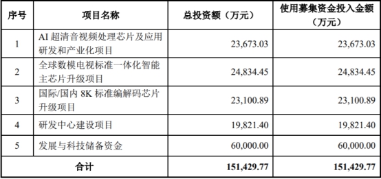 晶晨股份上市时披露的公告书显示,公司上市发行股份数量为4112万股,募集资金总额为15.83亿元,扣除发行费用后募集资金净额为15.03亿元,分别用于“AI超清音视频处理芯片及应用研发和产业化项目”、“全球数模电视标准一体化智能主芯片升级项目”、“国际/国内8K标准编解码芯片升级项目”、“研发中心建设项目”、“发展与科技储备资金”。