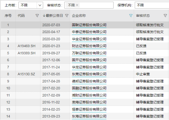 据wind证券统计,除已经过会领取发行批文的国联证券、中泰证券外,还有包括财达证券、万联证券在内的2家券商的IPO申请处于已反馈状态;包括华金证券、国开证券等在内的9家券商处于辅导备案登记受理状态;东莞证券的IPO申请暂时中止审查。