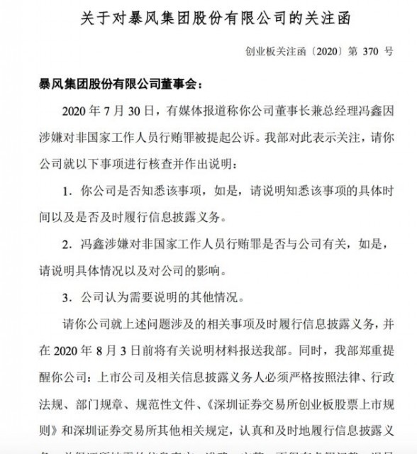 原标题:深交所向暴风集团(维权)下发关注函:要求说明对冯鑫行贿被公诉是否知情