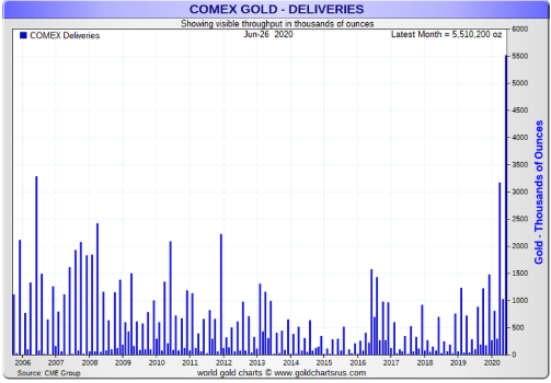 但纽约黄金的期金交易却显现出异常,本周四Comex期金8月合约有327万盎司(约101.7吨)黄金被要求交割,这是1994年有记录以来的最高单日交割量。