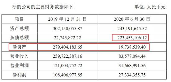 根据7月31日发布的《提示性公告》,标的公司宁波瑞源在2019年12月31日的净资产为2.79亿元,而仅半年之后的2020年6月30日,其净资产只剩下1973.85万元而已,也就是说,半年时间就出现了净资产减少2.5亿元的情况,而与此相反的是,其负债反而增加了2亿多元。