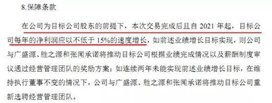 根据7月31日发布的《提示性公告》,股权转让协议的双方约定了“保障条款”,承诺标的公司在本次交易完成后且自2021年起,每年的净利润增长率不低于15%。