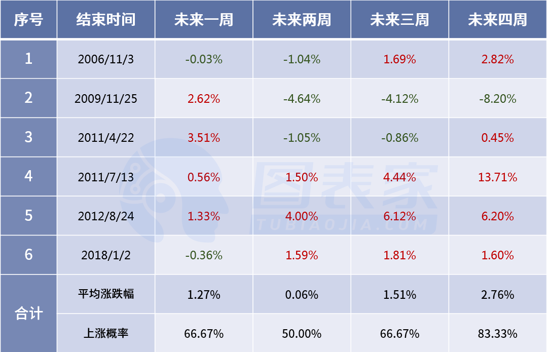 如上表所示,黄金在未来四周上涨概率高达83.33%,且平均涨跌幅高达2.76%。这意味着至少8日连阳在历史上倾向于是一个看涨信号。