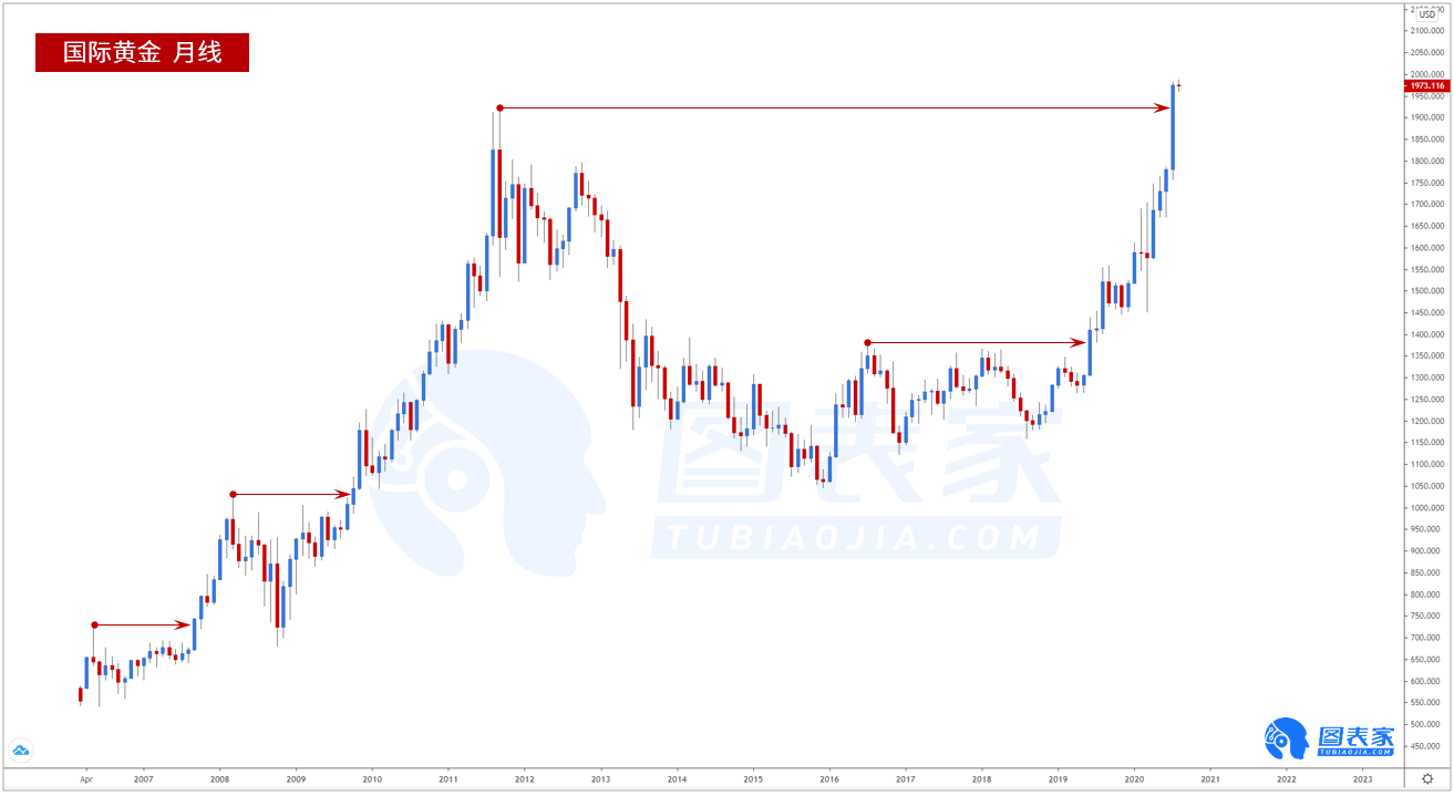 另一方面,黄金在7月突破2011年9月高点1921且月线收盘价收于该水平之上。Data Talks在2006年以来的月线走势中寻找月线收盘价突破至少一年以来峰值的情形,在图中以红色箭头标出,箭头的起点为峰值,而终点指向月线收盘价突破该峰值的K线。