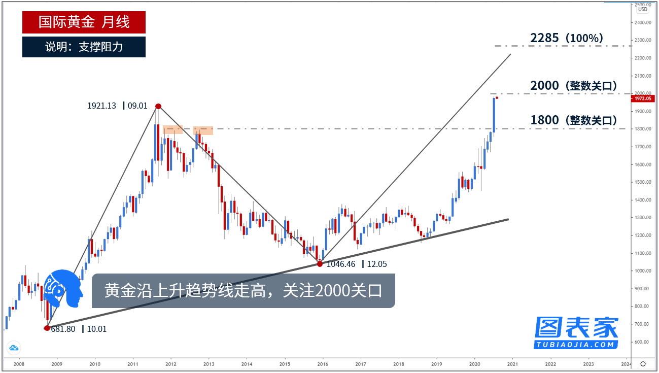 图为国际黄金月线走势,价格沿2008年10月低点以来的上升趋势线走高,2018年价格测试趋势线支撑后强劲反弹,目前已经突破2011年9月高点1921且正在接近2000关口。若该整数关口破位,进一步上涨目标见斐波那契100%延展位2285.