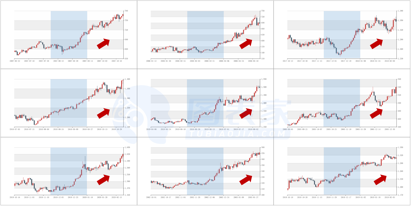 由上图可以看出,在月线收盘价突破峰值之后,接下来的一个月中,黄金往往继续上涨,月线收阳的概率高达100%。