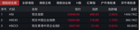 8月4日早盘,港股波澜不惊,但午后突然直线拉升,恒指最高升至25062.41点。截至收盘,恒生指数涨2.00%,报24946.63点,逼近25000点关口;恒生中国企业指数涨1.70%,报10203.88点;恒生香港中资企业指数涨0.52%,报4047.63点。