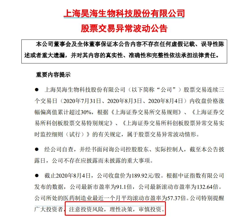 然而,股价连续暴涨,在8月4日科创板明显回调的背景下,昊海生科依然大涨20%涨停,还是引起公司提示风险。