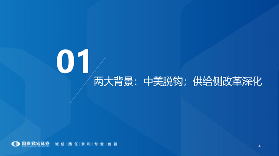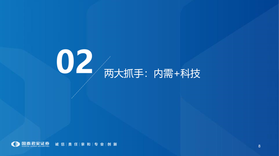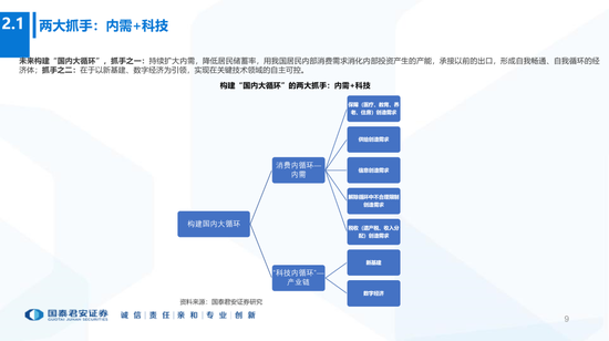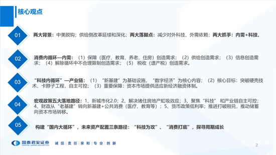 1、两大背景:中美脱钩;供给侧改革延续和深化;两大落脚点:减少对外科技、外需依赖;两大抓手:内需+科技。
