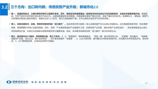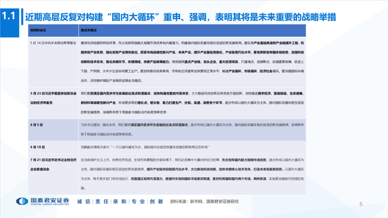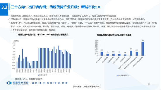 4、宏观政策五大落地路径:(1)新城市化2.0;(2)解决堵住房地产虹吸效应;(3)聚焦“科技”和产业链自主可控;(4)财政从“老基建”转向新基建+公共消费(医疗、教育等);(5)货币政策低利率延续;推进打破刚兑,推动储蓄向资本市场转移。