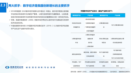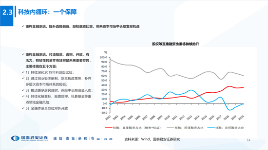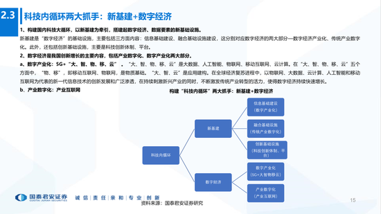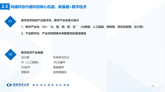 3、“科技内循环”—产业链:(1)“新基建”为基础设施,“数字经济”为核心内容;(2)核心目标:突破硬壳技术、卡脖子工程,自主可控;(3)重要保障:资本市场提供适应新经济融资体制。