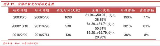 中泰证券、平安证券、西南证券、国泰君安等机构均提出,随着黄金价格持续上涨,金银比存在较大的修复空间,白银更具备超涨的潜力,从中泰证券对金银币修复行情历史复盘中,白银价格的十足弹性清晰可见。