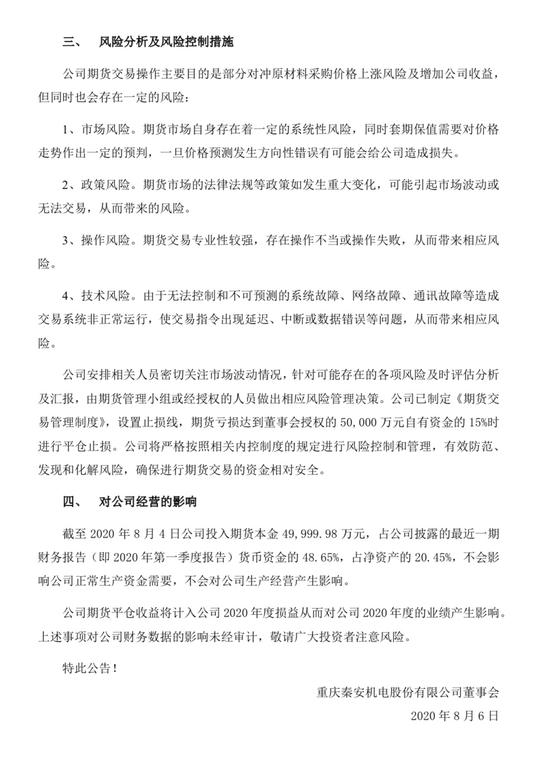 秦安股份的投资主要在于原材料铝的期货投资。2019年原材料铝的采购额占产品制造成本的21.34%,约1.14亿元。秦安股份称基于长期跟踪铝现货价格走势的判断,为能在现货市场的价格波动中把握节奏,降低现货采购成本及增加公司收益,同意使用不超过5亿元人民币投资原材料套期保值业务及期货投资(期货投资品种不限于铝)。公司董事会继5月份授权期货交易额度5亿元后,又于7月份增加了2亿元额度,合计7亿元。