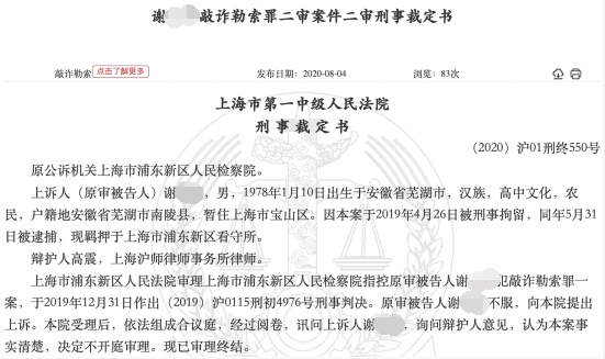 近日,上海第一中级人民法院对此案作出了终审裁定,驳回谢某上诉,维持原判,对其犯敲诈勒索罪,判处有期徒刑三年,并处罚金人民币六千元。