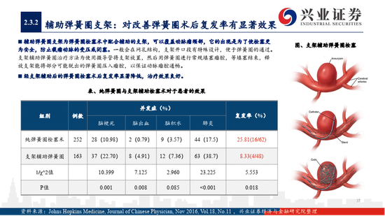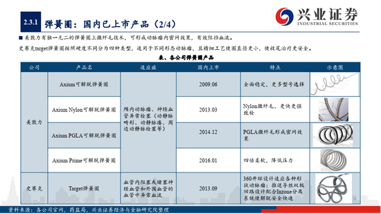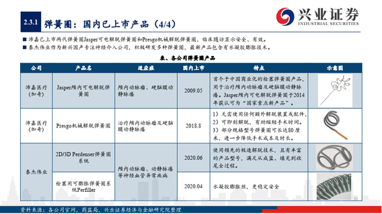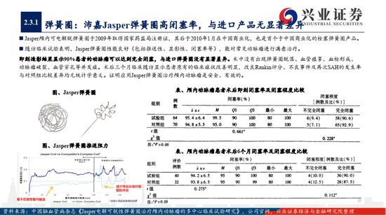 1)国内弹簧圈、导丝导管技术相对成熟,多家公司已有产品上市,如沛嘉医疗的Jasper与Presgo弹簧圈、泰杰伟业最新的水凝胶可膨弹簧圈等,性价比是国产替代的关键,支架辅助弹簧圈,球囊导引导管系统等组合模式是新兴发展方向,在宽颈动脉瘤等适应症上具有较明显优势;